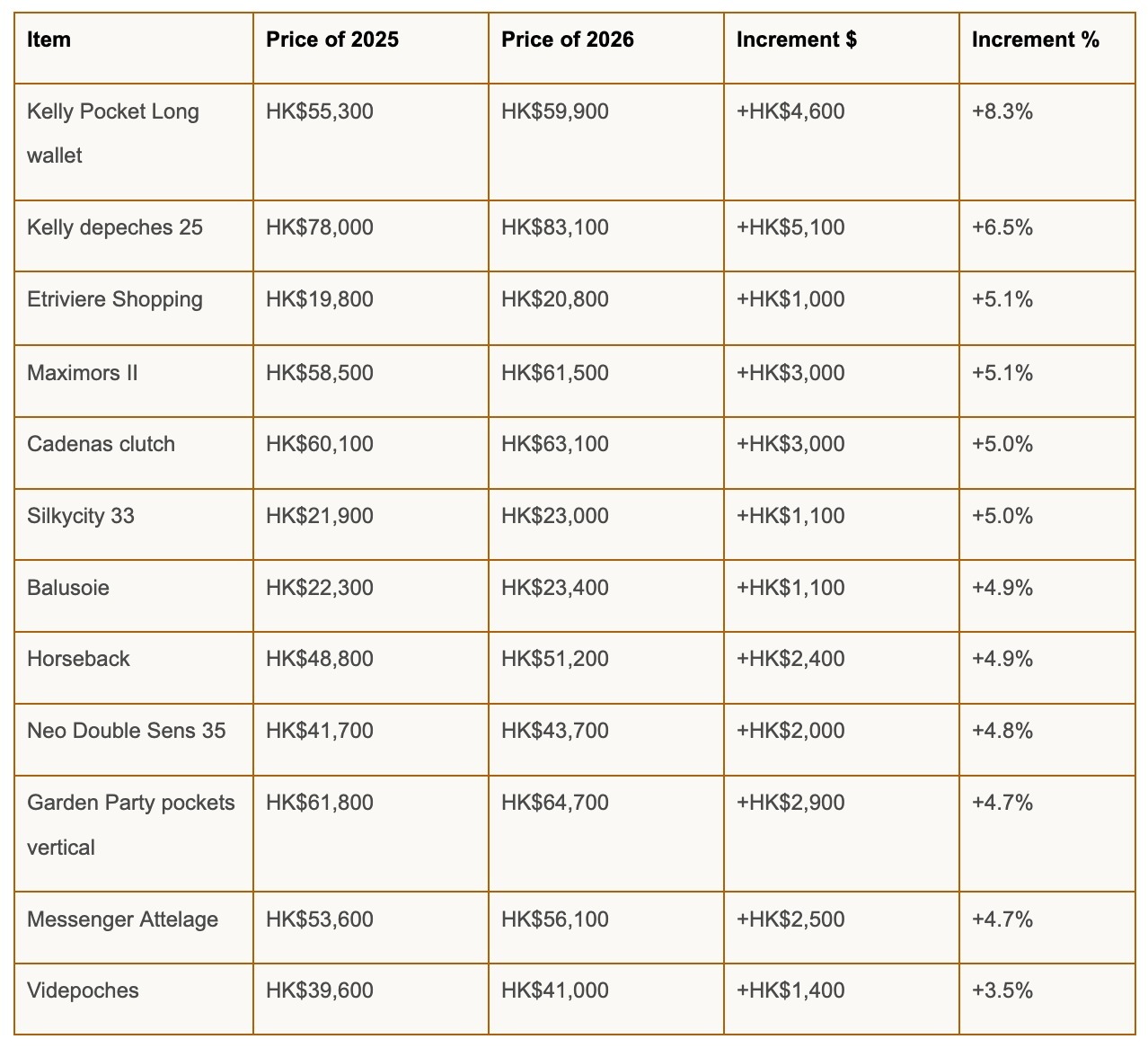 Below is the reference of the increment of 2026 in Hong Kong. For any price that is not shown, please whatsapp us for inquiry.